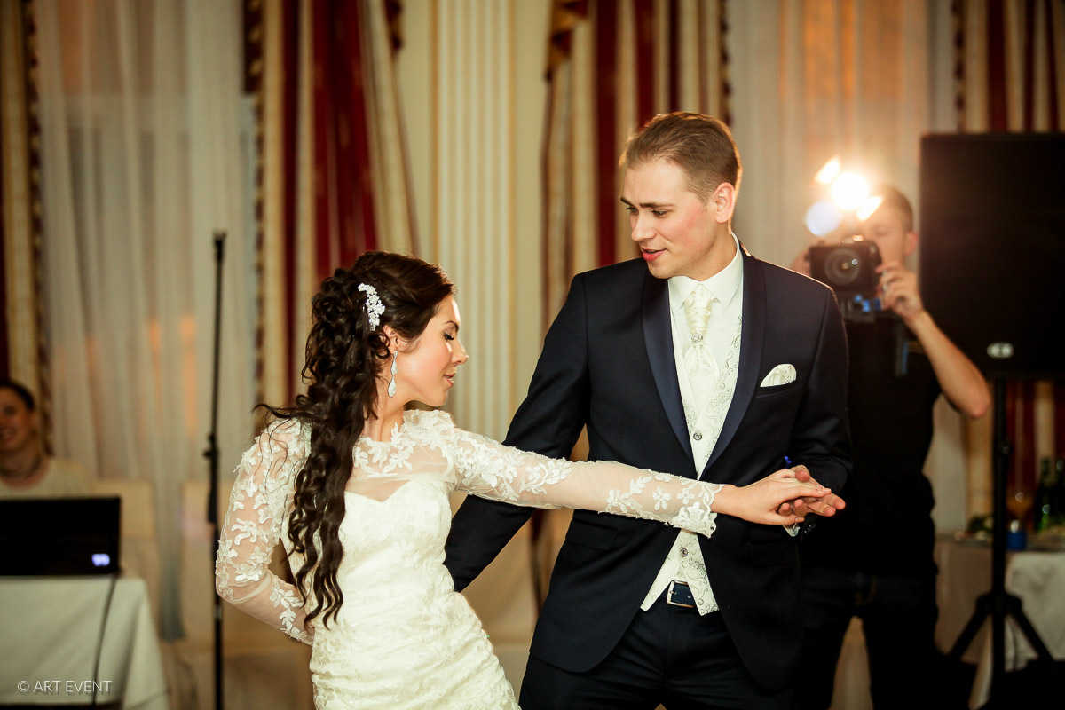 - жених и невеста кружатся в вальсе, целуются;