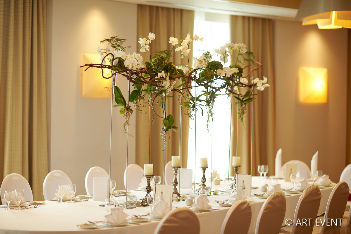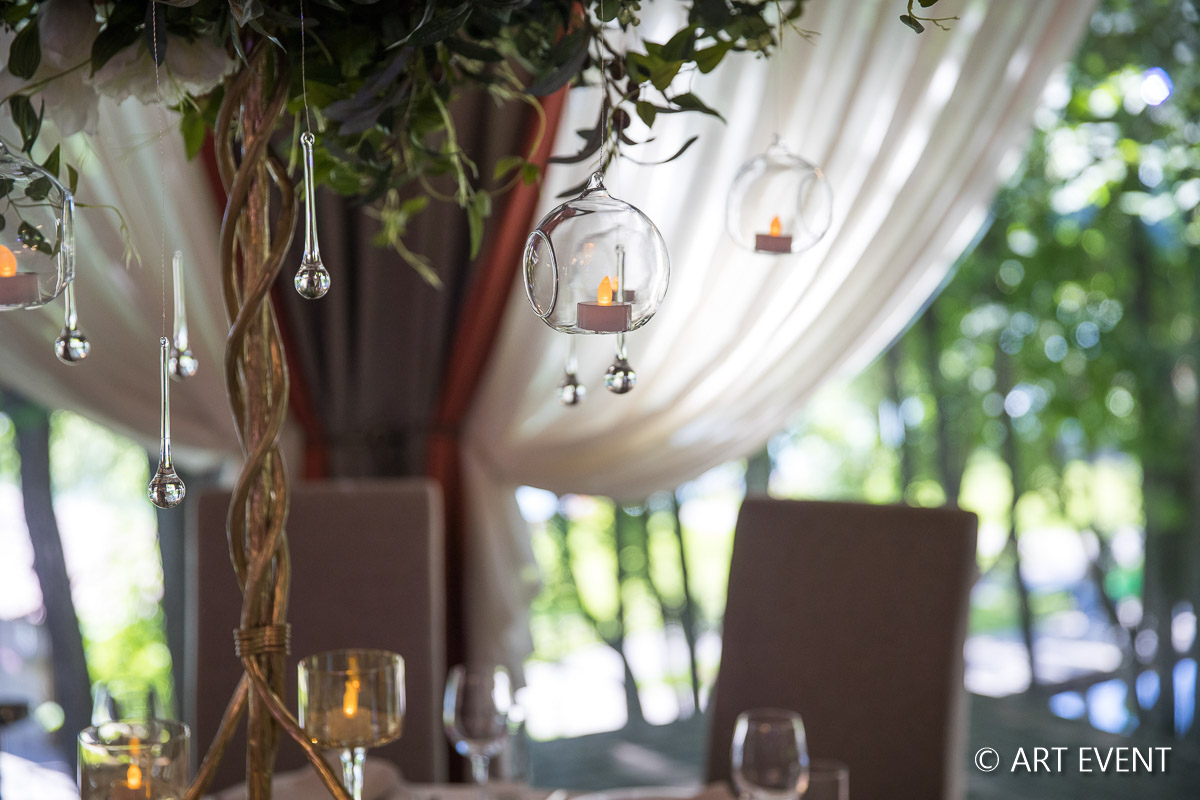Самый простой вариант — просто расставить подсвечники на столах в банкетном зале. Так каждый из гостей окажется в уютной обстановке, а сами свечи станут дополнительным украшением. Кроме того, подсвечники могут располагаться по всему залу.