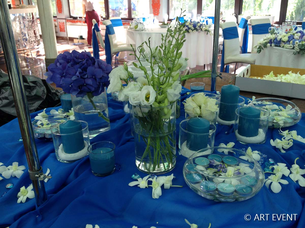 Отдельного внимания стоит удостоить «плавающие» свечи. Сами по себе такие свечи маленькие и достаточно простые, но они эффектно смотрятся в композициях. Для таких свечей необходима неглубокая и круглая ваза или чаша, которая заполняется водой. На поверхности воды размещаются свечи, а также бутоны цветов и их лепестки. Дно чаши украшается песком и камнями. Подобные композиции можно разместить как на столах, так и по всему периметру банкетного зала.