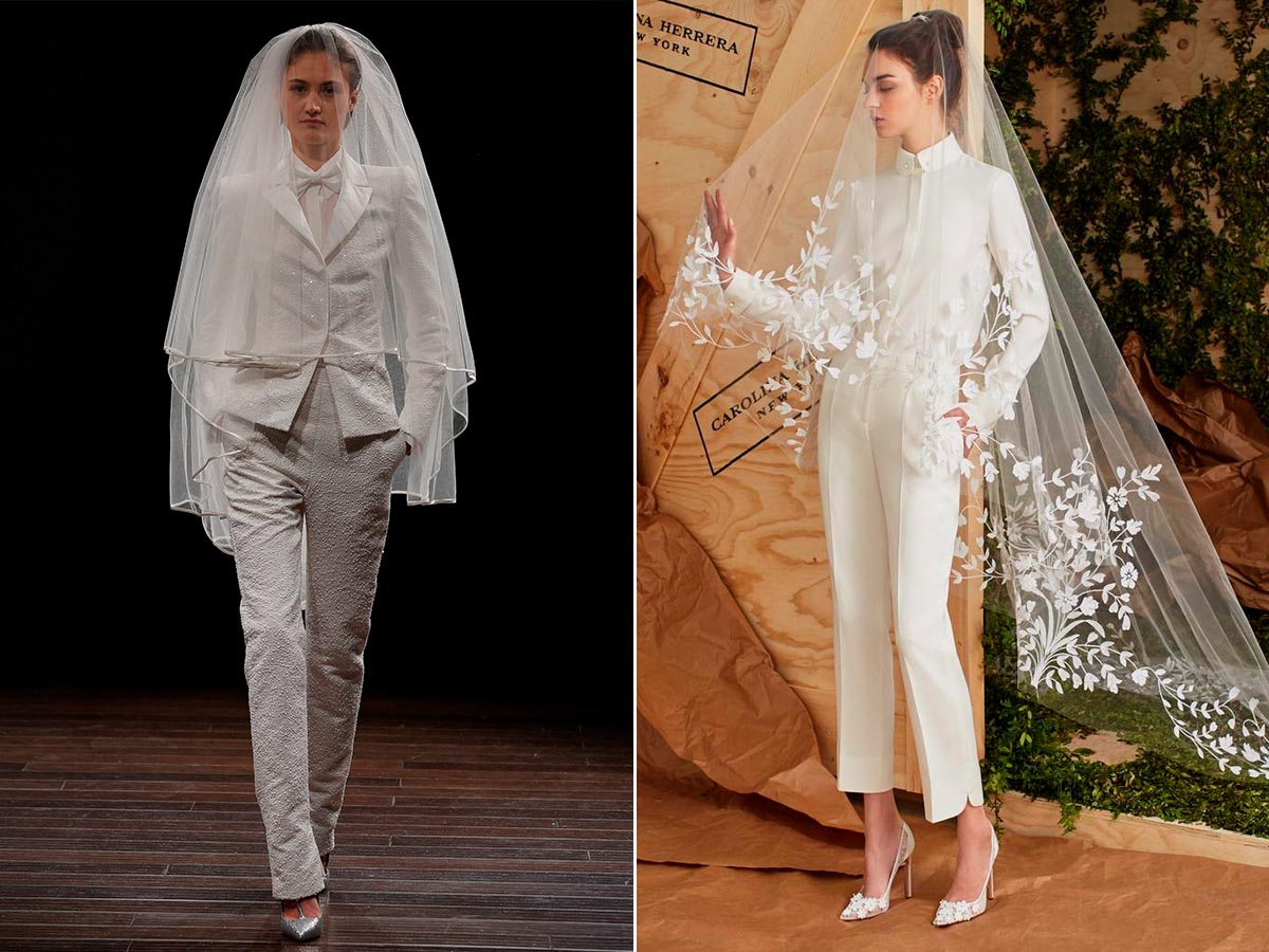 Свадебный костюм невесты, как правило, представляет собой брюки и пиджак, фасоны которых могут быть различны и подбираться под конкретные особенности фигуры. Для изящных и длинноногих невест идеальным вариантом могут стать узкие брюки и приталенный укороченный пиджак. Для невест с более пышными формами и широкими бёдрами — пиджак прямого кроя и широкие брюки. При этом брюки могут быть как прямыми, так и расклешёнными, а рукава пиджака могут иметь различную длину.