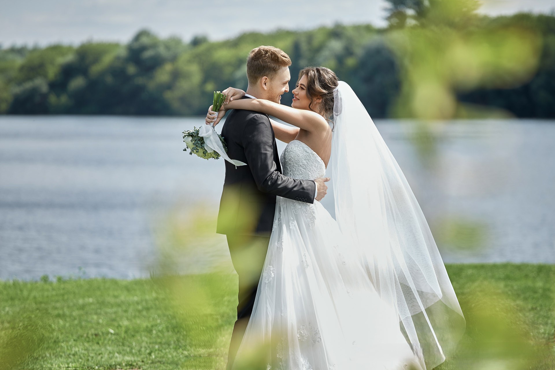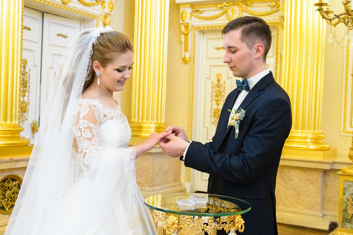 Образ невесты строится вокруг силуэта и ткани, платье подчёркивает торжественность момента, а церемония проходит в строгом, но эмоционально насыщенном формате.