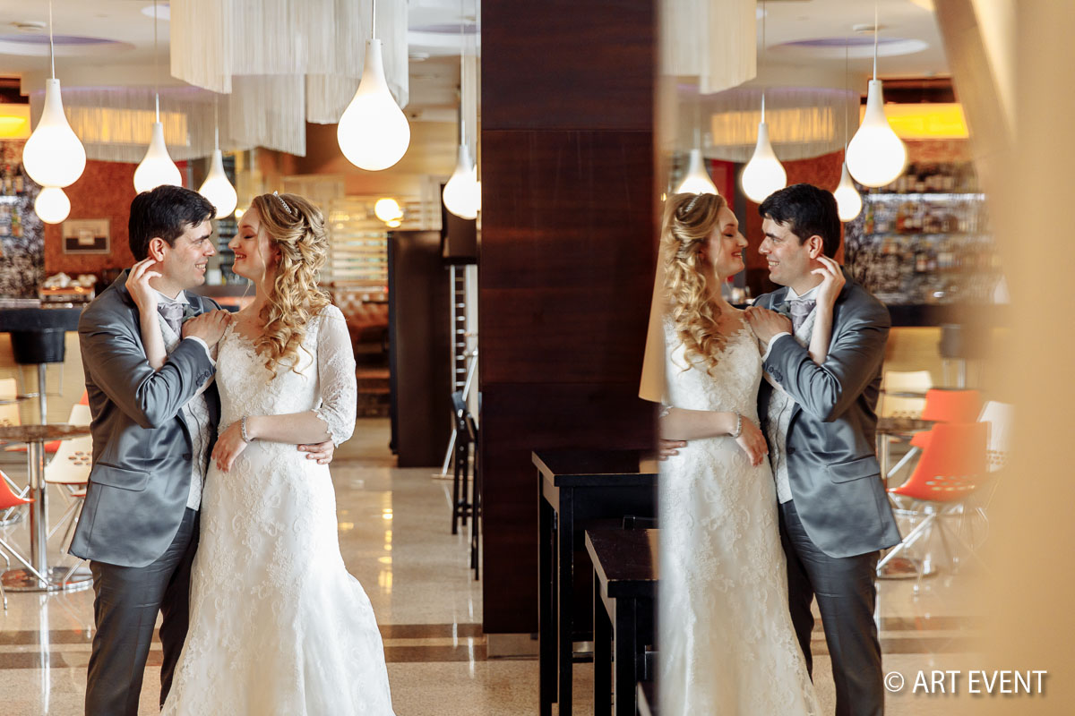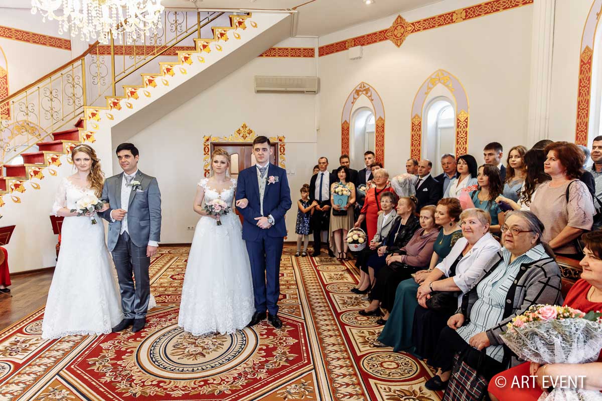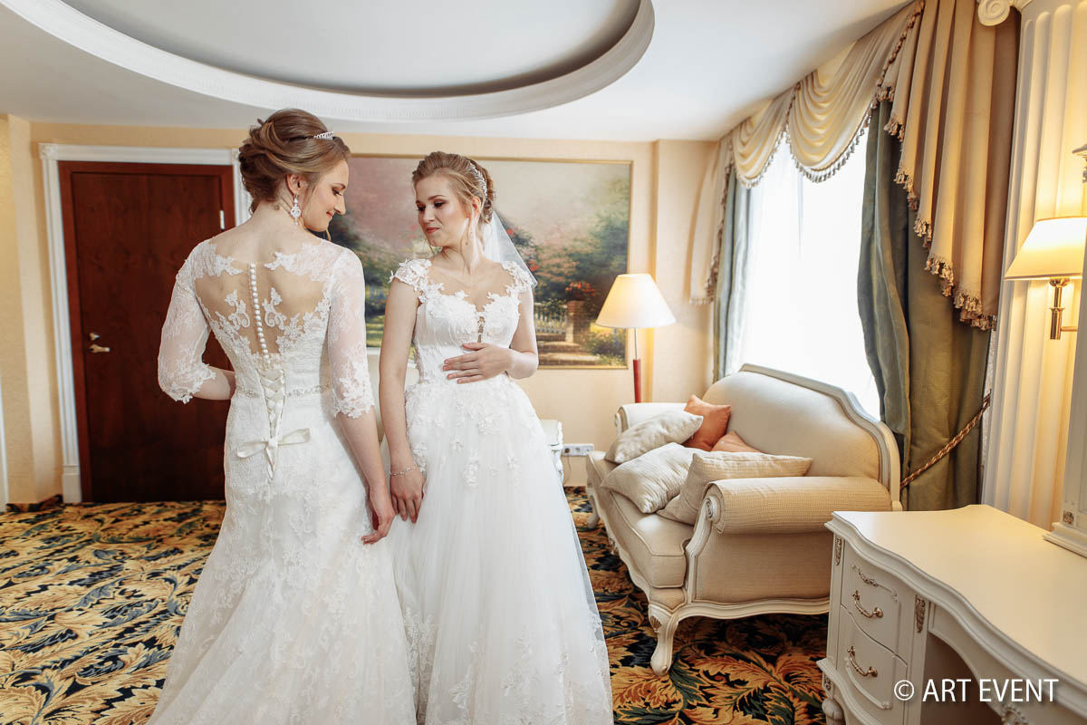 «Утро невесты» превратилось в «утро невест». Для подготовки и фотосъёмки мы предложили девушкам «люкс» в гостинице неподалёку от ЗАГСа, чтобы сократить время на дорогу. Как они и хотели, церемония бракосочетания была единой для обеих пар. Сотрудники ЗАГСа то и дело путали заученный текст и исправлялись на «женихов» и «невест», но это только добавило изюминку церемонии.