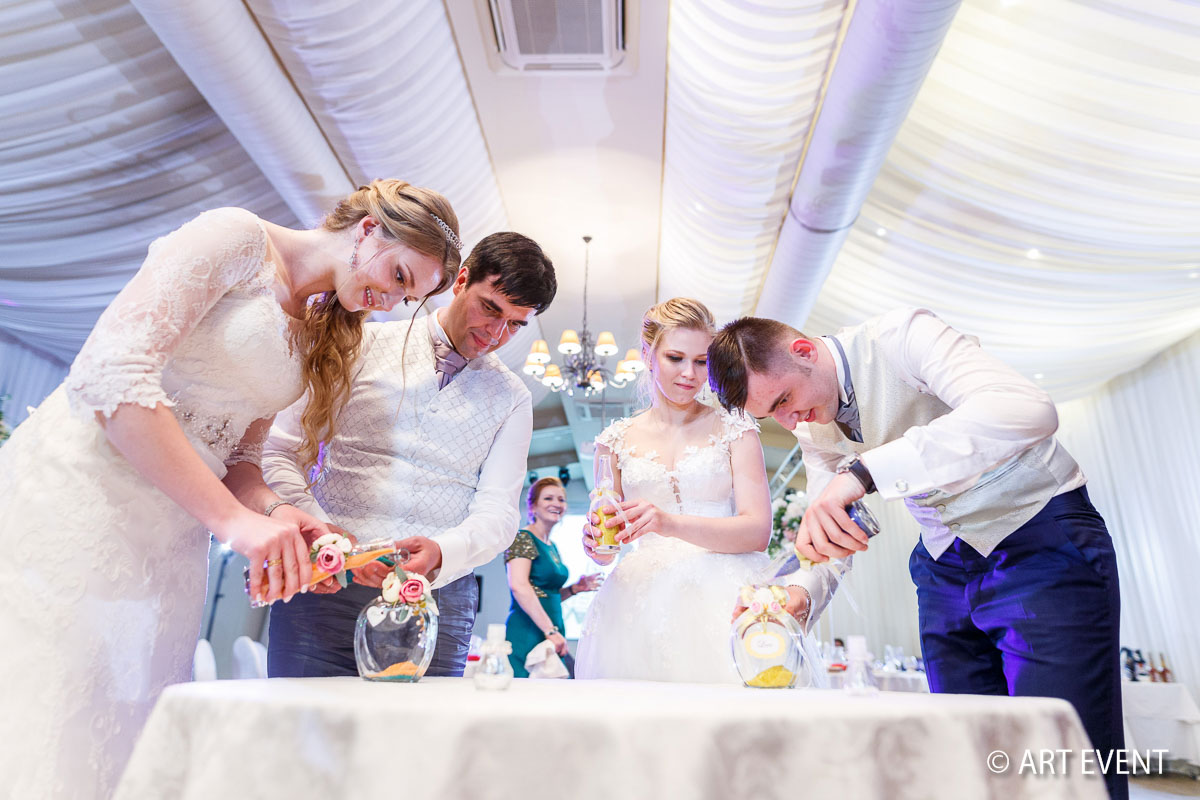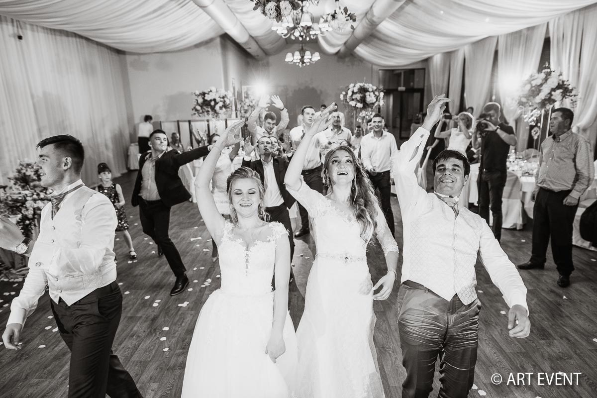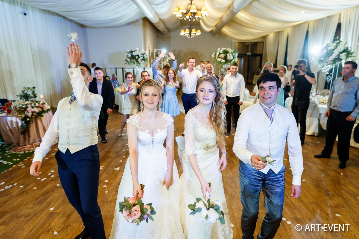 Кульминация этой уникальный свадьбы пришлась на самый яркий и волнующий момент вечера: вновь вместе Александра и Ангелина вышли на танцпол, чтобы бросить букеты, и их женихи — теперь уже мужья — немедленно к ним присоединились.