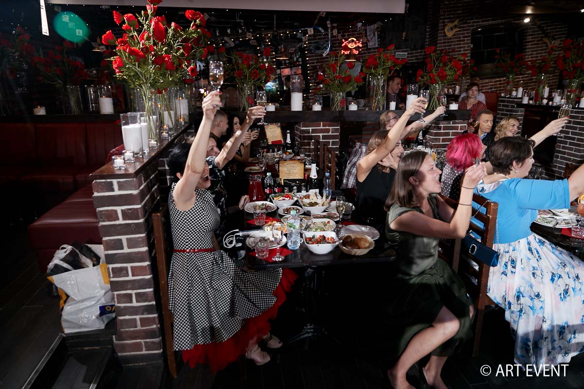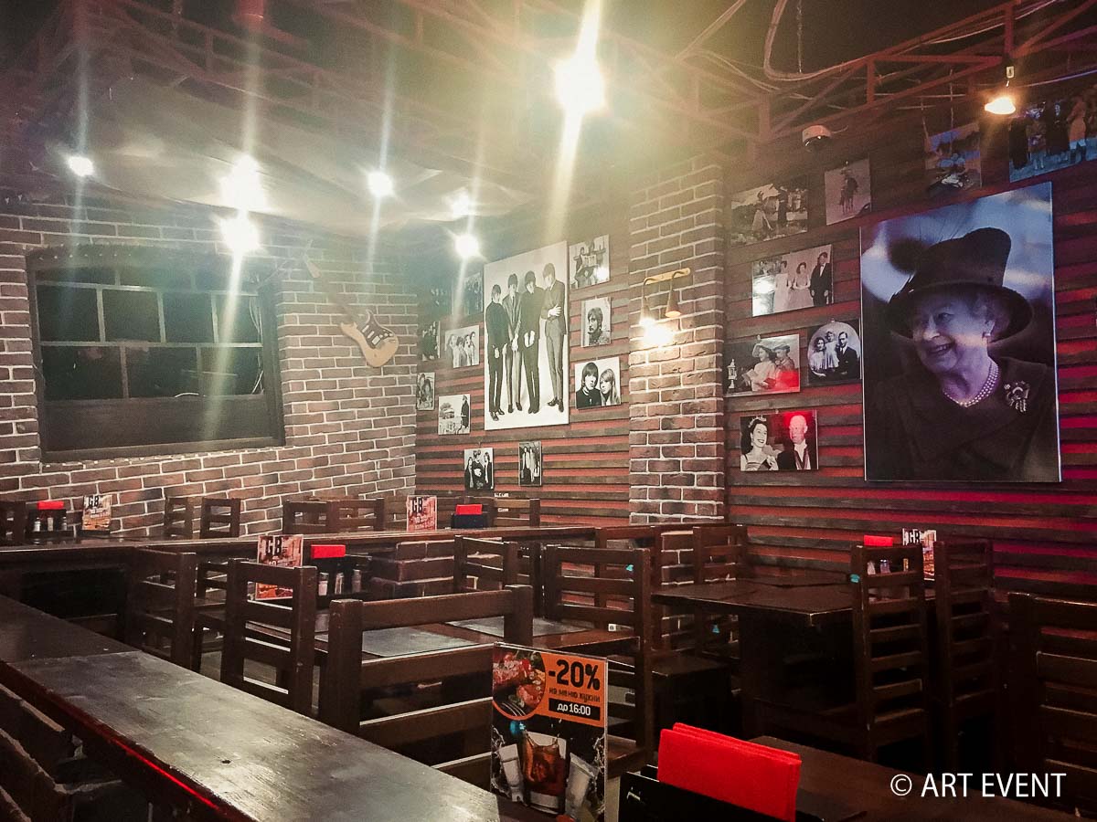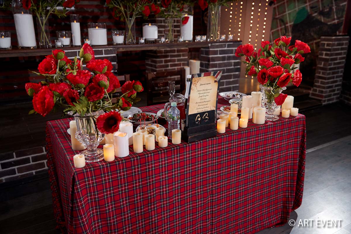 Чтобы подчеркнуть стилистику 60-ых годов, мы предложили для празднования английский паб на востоке Москвы, где на стенах можно увидеть и фото Елизаветы и Черчилля, и музыкальные инструменты, популярные в те времена. Красные маки — ещё один атрибут английского стиля — стали заглавной темой в оформлении зала.