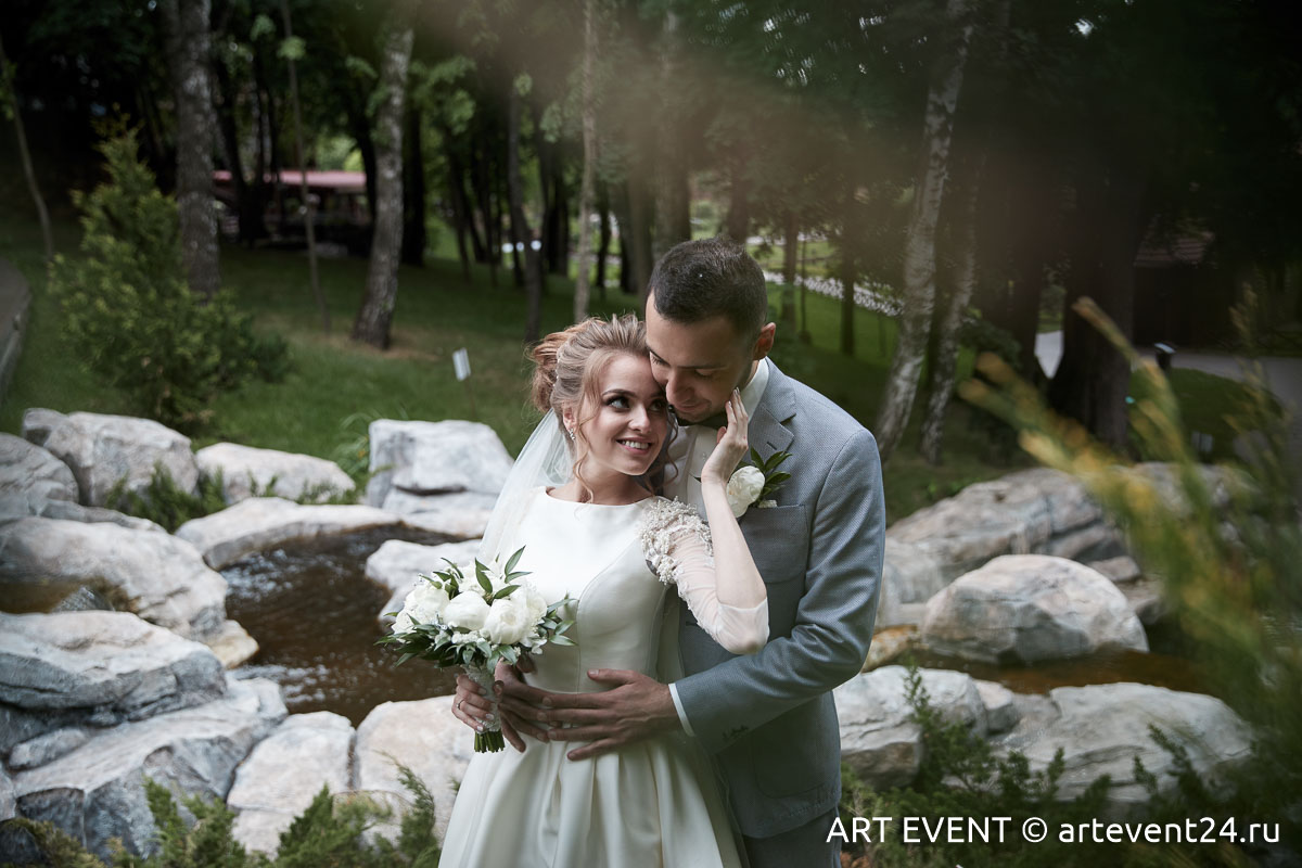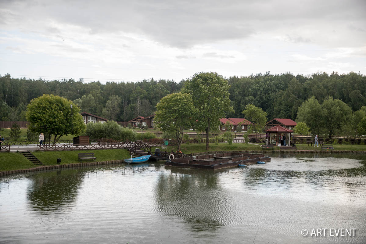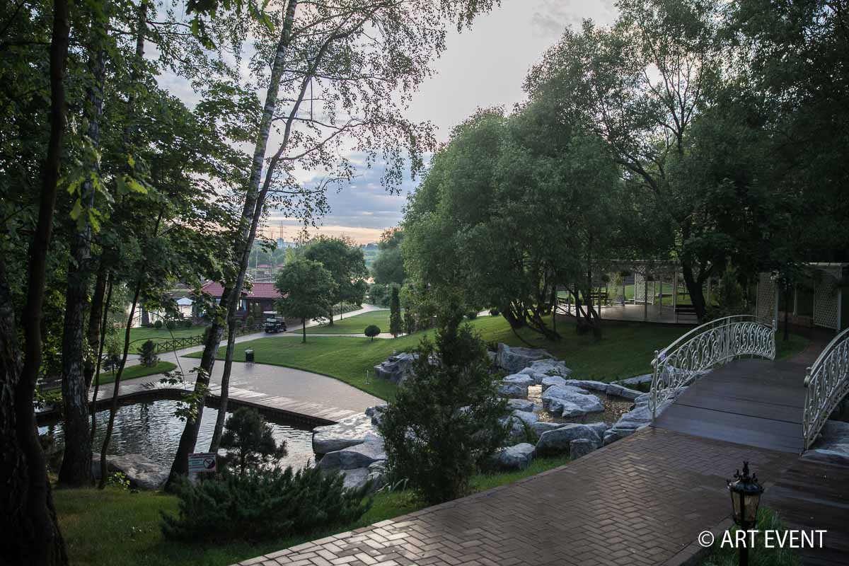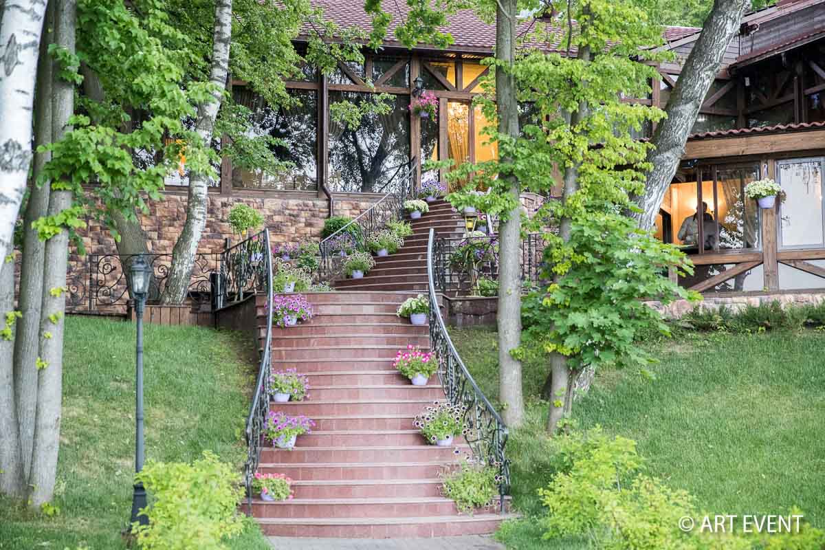 Трудно состязаться с красотой живописных ландшафтов, которые создала сама природа, поэтому оформление свадьбы стало своеобразным продолжением летней зелени и густого леса, обрамляющего этот уютный загородный комплекс.