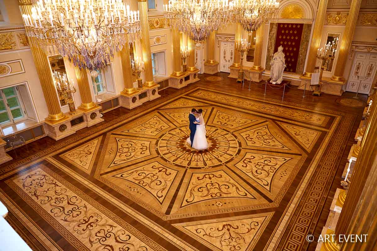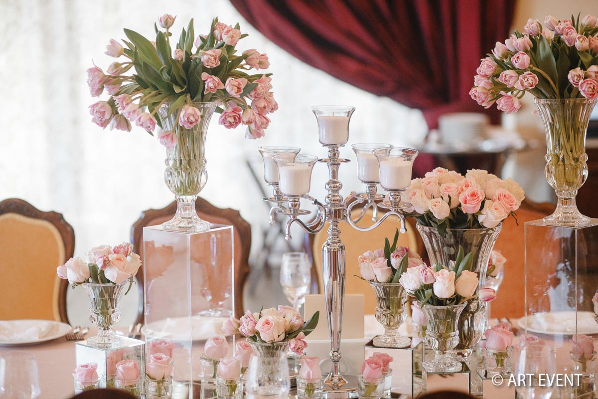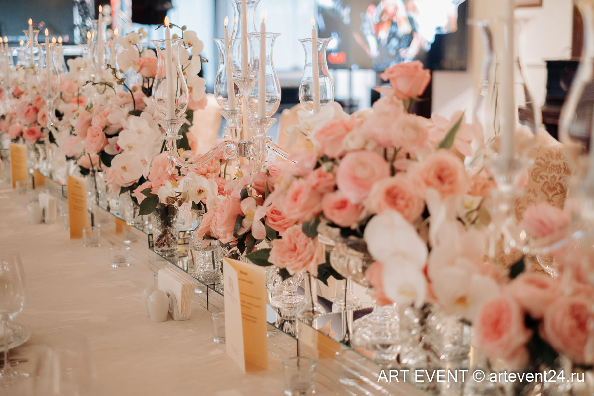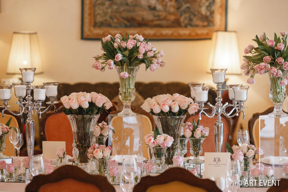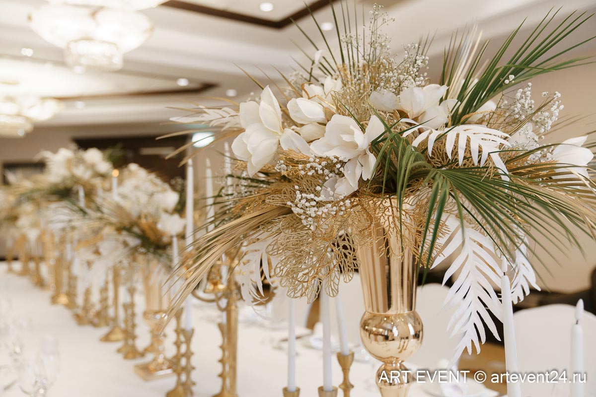 • Оформление зала (флористика + декор): столы гостей, президиум, букет невесты, бутоньерка жениха