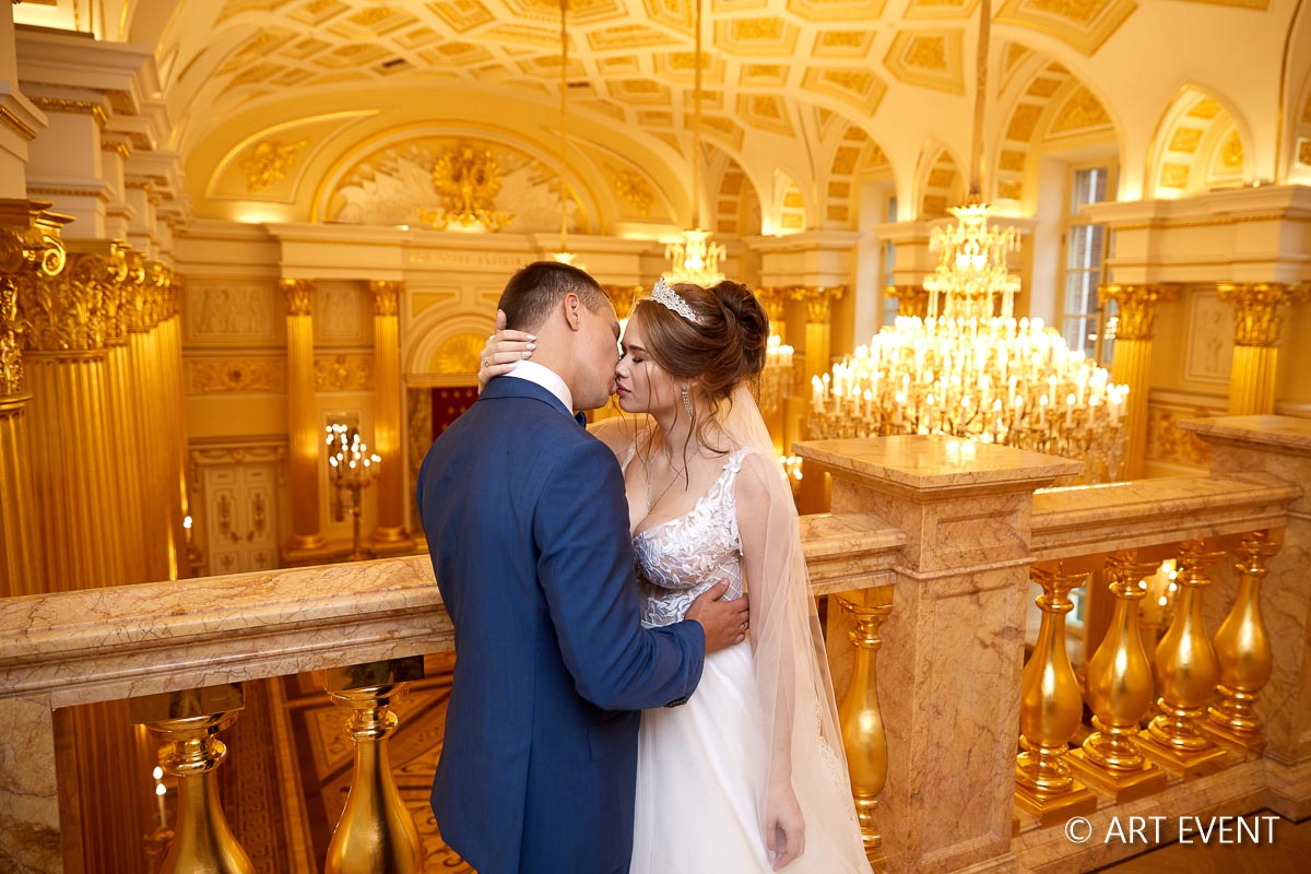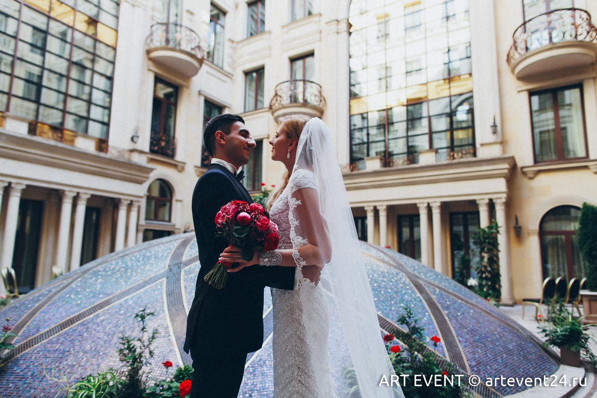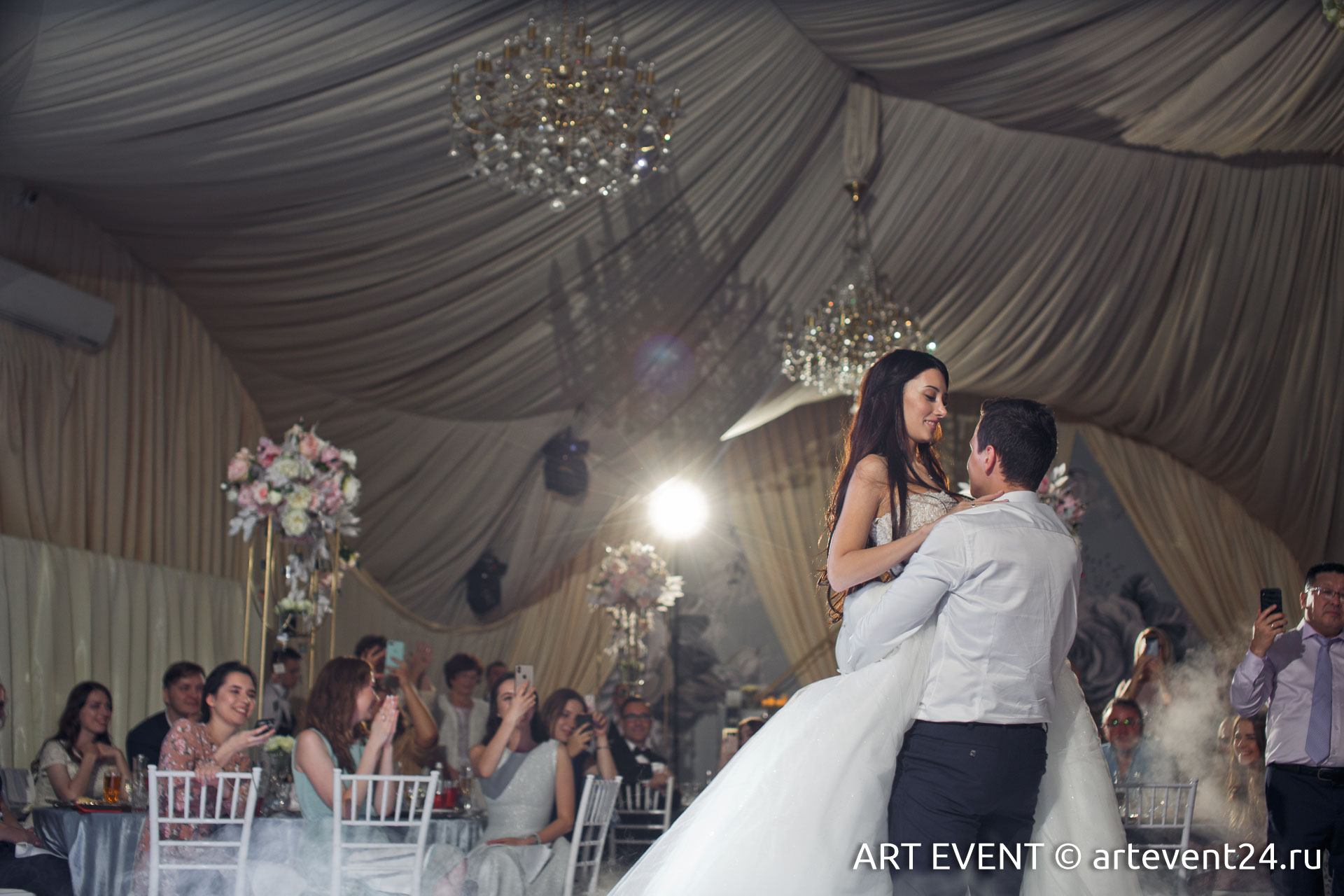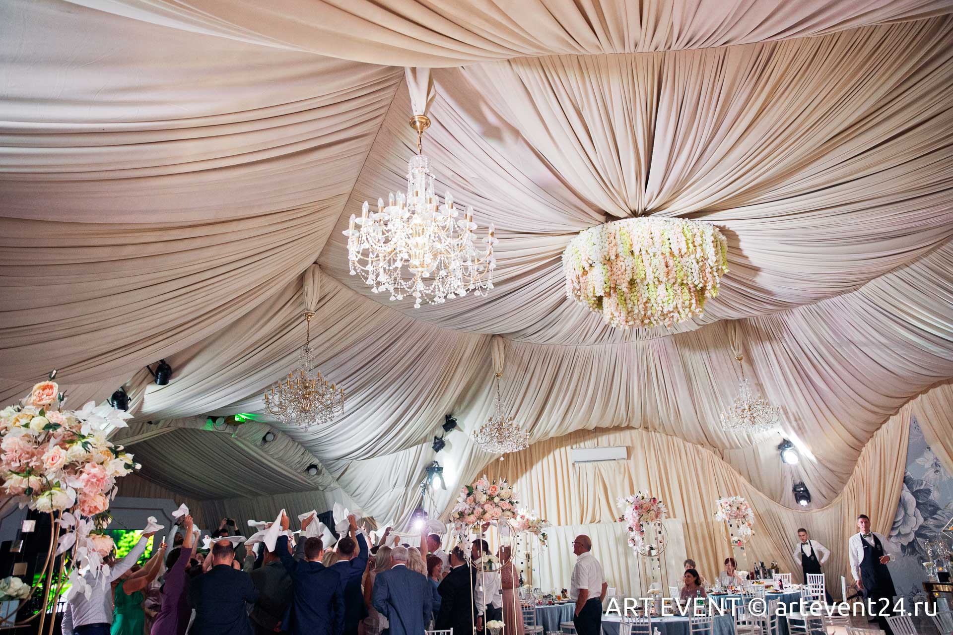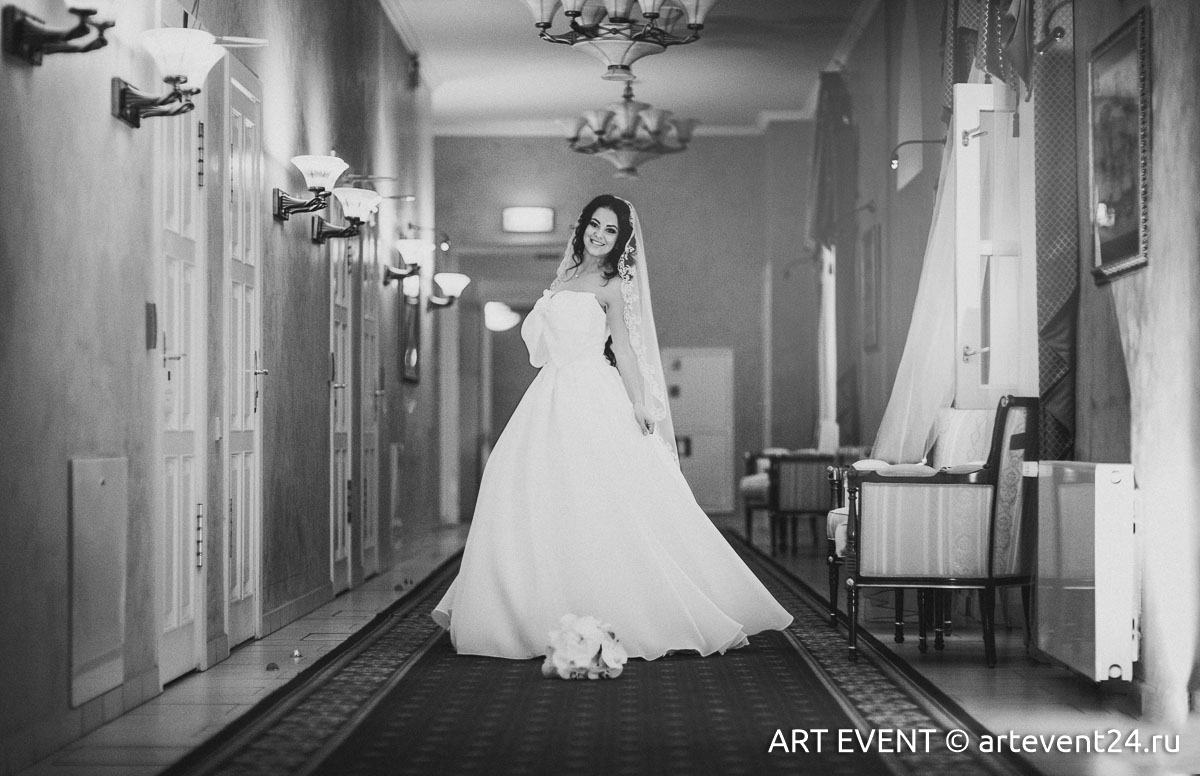 • Оформление зала (флористика + декор): столы гостей, президиум, букет невесты, бутоньерка жениха