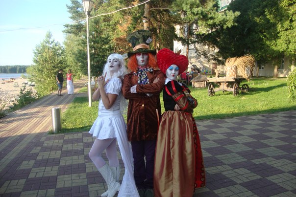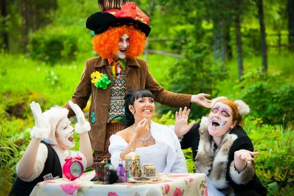 - «Алиса в стране чудес» — путешествие невесты и жениха в Зазеркалье начинается с самого утра, когда домой к жениху и невесте приходят герои сказки, гостей на месте торжества ждут различные сюрпризы, розыгрыши, превращения. Пригласительные, например могут быть сделаны в виде диска или флешки, на котором записано сказочное видео приглашением на чаепитие к Чеширскому коту.