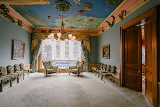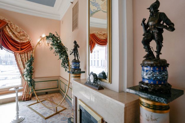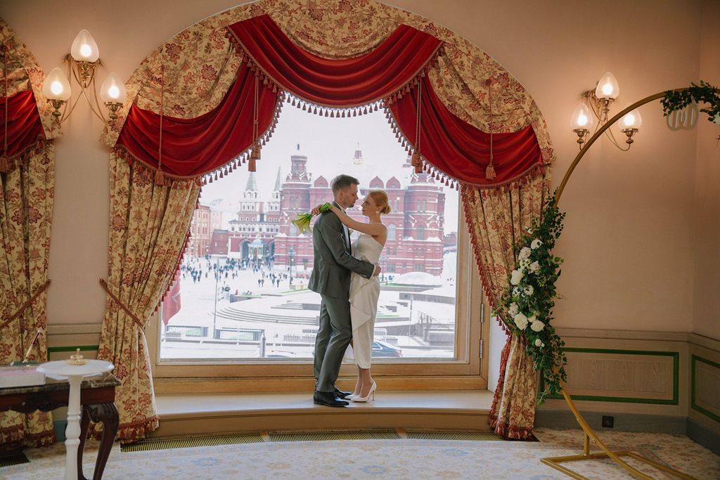 В гостинице «Националь» можно окунуться в роскошную атмосферу Золотого века России. Отель был возведён в 1903 году знаменитым архитектором Александром Ивановым. Это образец имперской архитектуры в историческом центре Москвы. Зал "Суздаль", в котором проходят церемонии, украшен антиквариатом: старинными вазами, лампами, зеркалами, статуями и картинами. А во время торжественной регистрации брака видны Кремль и Красную площадь.