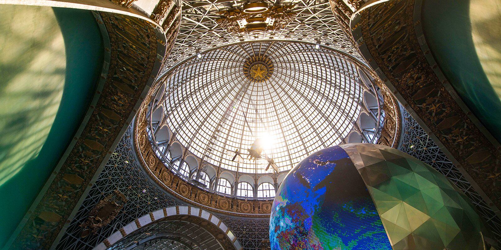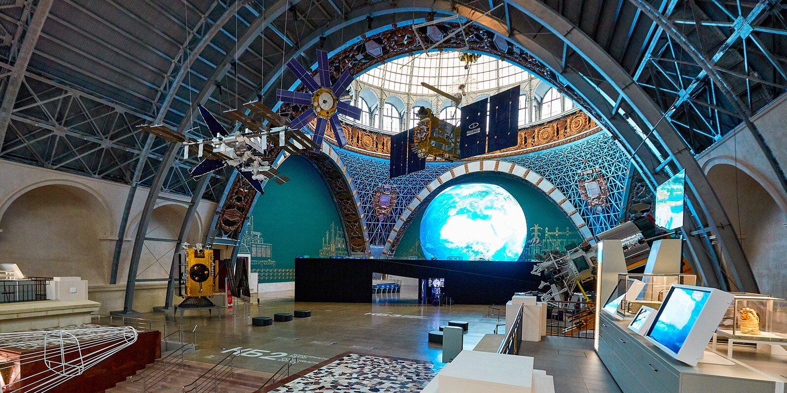 Торжественные церемонии проходят в подкупольной части на фоне вращающейся модели планеты Земля. Величественный купол высотой 60 метров — визитная карточка павильона.